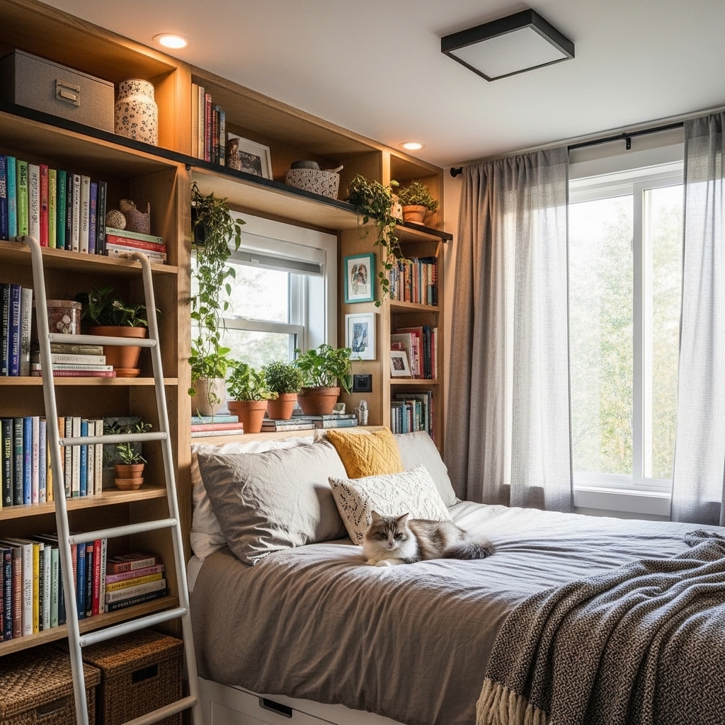 Built-in shelving is an excellent way to utilize vertical space while keeping your bedroom organized. These shelves can be installed above the bed or along empty walls, providing storage for books, decorative items, or personal belongings. This not only saves floor space but also adds character to your tiny room.