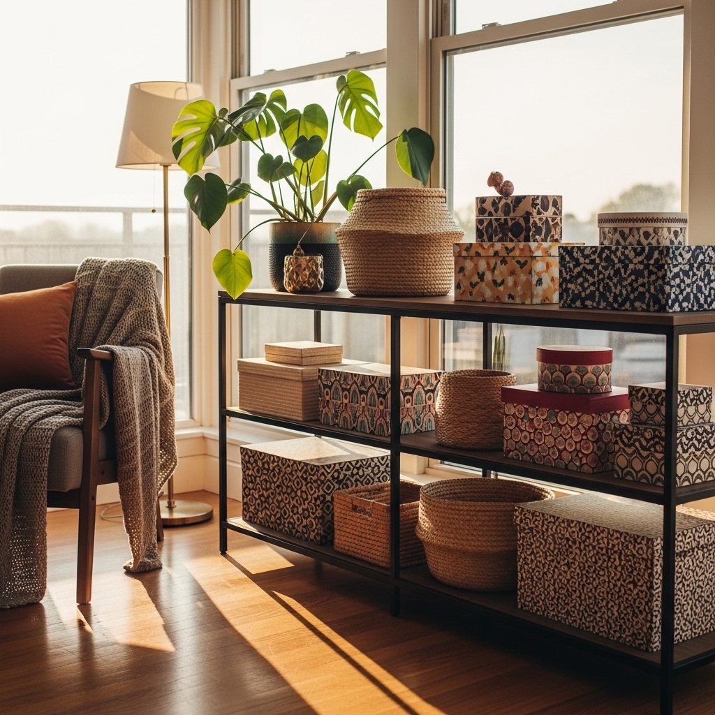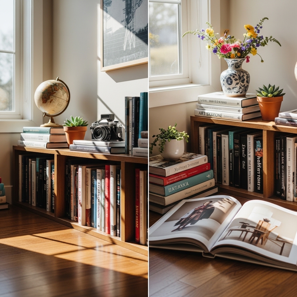 Decorative boxes and baskets are perfect for keeping your shelves organized while adding a stylish touch. Use them to store items that you want to keep out of sight, like remote controls or miscellaneous papers. Choose boxes that complement your decor style—woven baskets for a boho look or sleek boxes for a modern aesthetic. This practical storage solution can help maintain a clean appearance while still showcasing a few key decorative items on top.