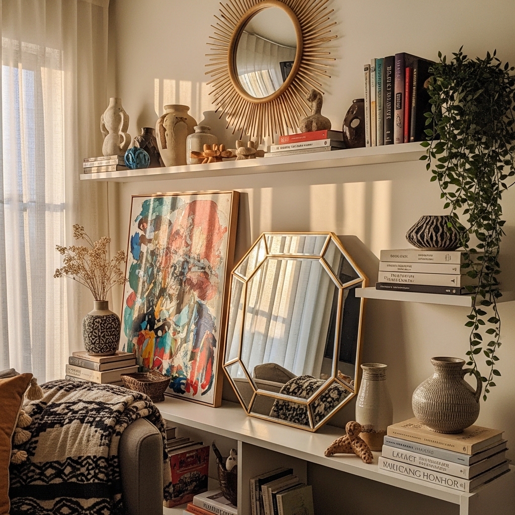 Layering artwork and mirrors on your shelves adds depth and sophistication. Place a small framed piece of art or a mirror at the back of the shelf to create a backdrop for other items. This technique not only draws the eye upwards but also reflects light, enhancing the space’s brightness. Choose pieces that complement your decor style and add interest, ensuring that they harmonize with the other elements on the shelf for a polished look.