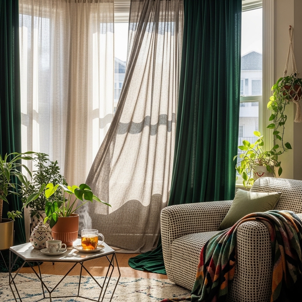Combining different curtain materials, such as velvet and linen, can create a rich, multi-dimensional look. Layering adds depth and interest, allowing you to play with opacity and light. This technique not only looks stunning but also offers versatility in controlling light and privacy. Perfect for cozy spaces like the living room, layered textures can make a room feel more inviting.
