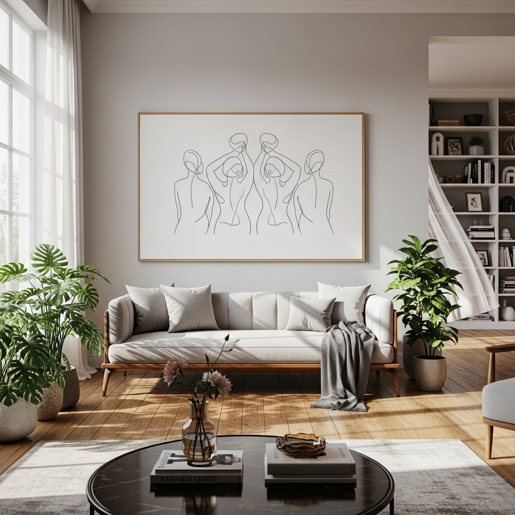 Minimalist line art is a chic and contemporary choice for wall decoration. These simple yet striking designs often feature continuous lines that create abstract forms or figures. They can easily complement various styles, from modern to Scandinavian, and add an artistic touch without overwhelming the space. Pair several pieces together for a cohesive look or keep it simple with a single large piece.