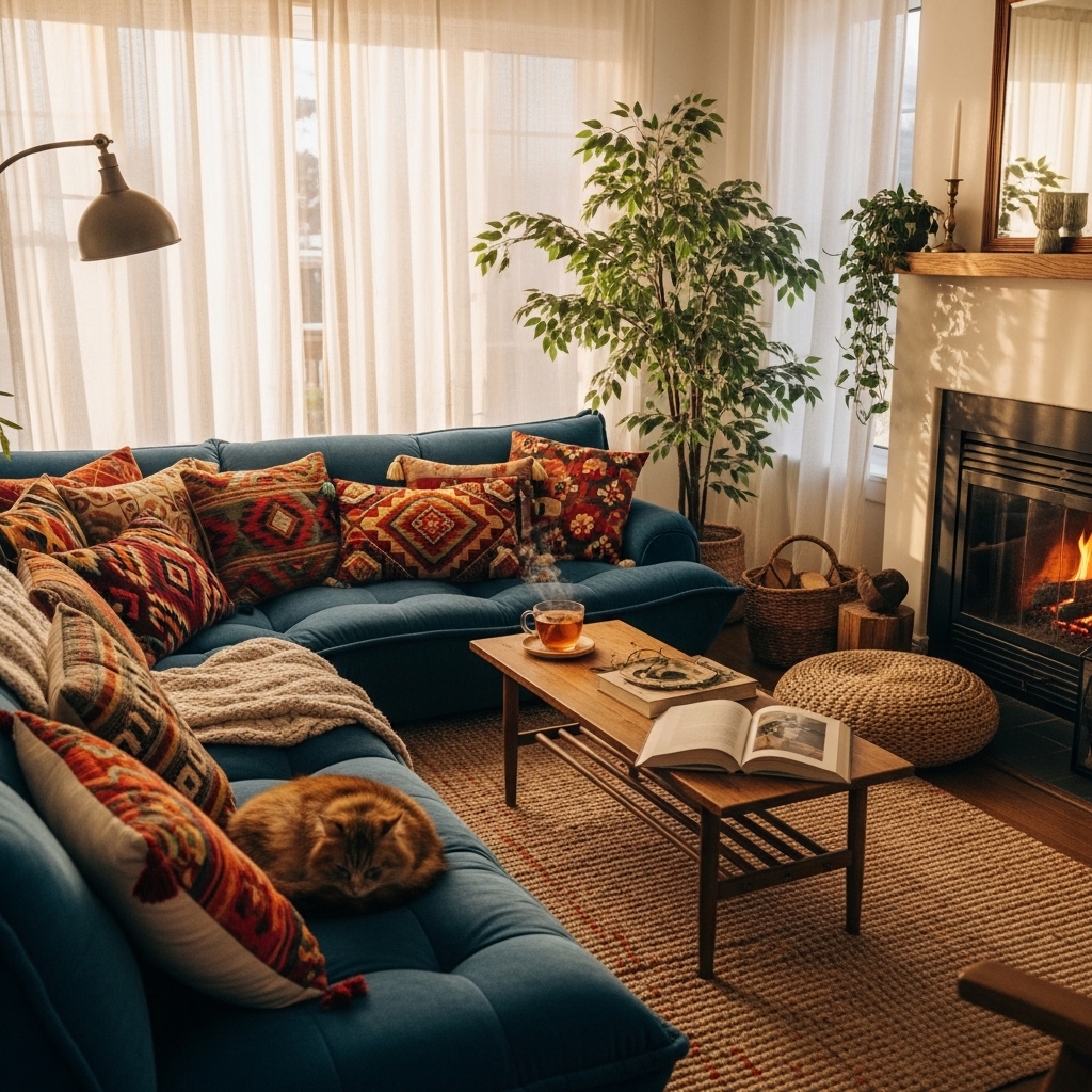 Incorporating layered textiles is a simple way to add warmth and comfort to your living room. Think plush throw blankets, soft cushions, and textured rugs. Mixing different materials like wool, cotton, and faux fur can create an inviting look. Choose a color palette that feels soothing—like soft neutrals or warm earth tones—to enhance the cozy vibe.