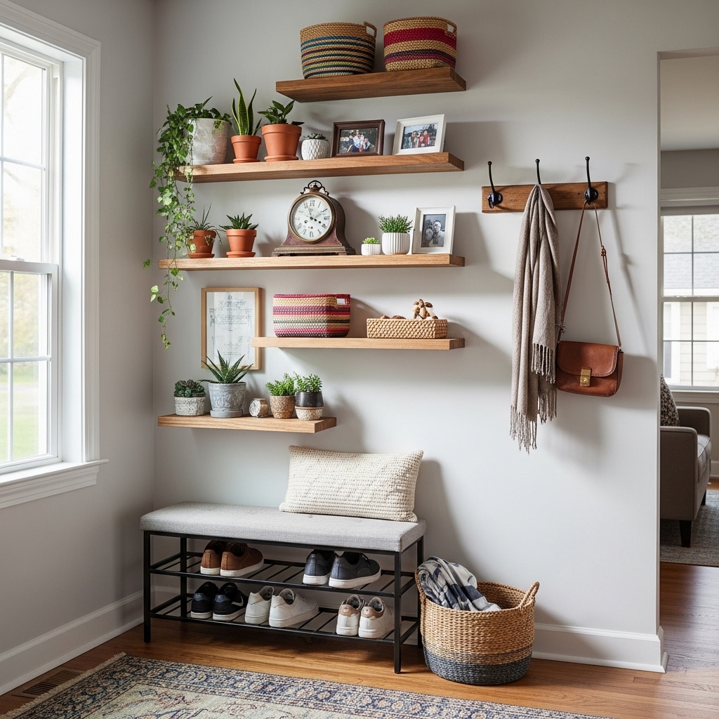 Wall-mounted shelves are a fantastic way to utilize vertical space in your entryway. They can hold everything from keys and mail to decorative items and plants. By keeping items off the floor, you create a more spacious feel while also adding a personal touch to your home decor. Choose shelves that match your style, whether it’s rustic wood or sleek metal, to enhance your entryway’s aesthetic.