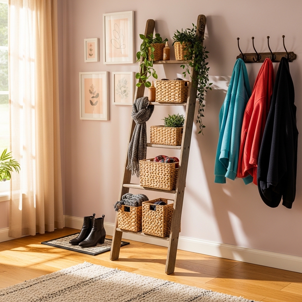 Ladder storage units are trendy and functional, offering a unique way to display and store items in your entryway. These can hold bags, hats, or decorative elements, creating an eye-catching focal point. Ladders can be leaned against the wall or hung for a more permanent fixture. Choose a ladder style that complements your decor to enhance your entryway’s character.