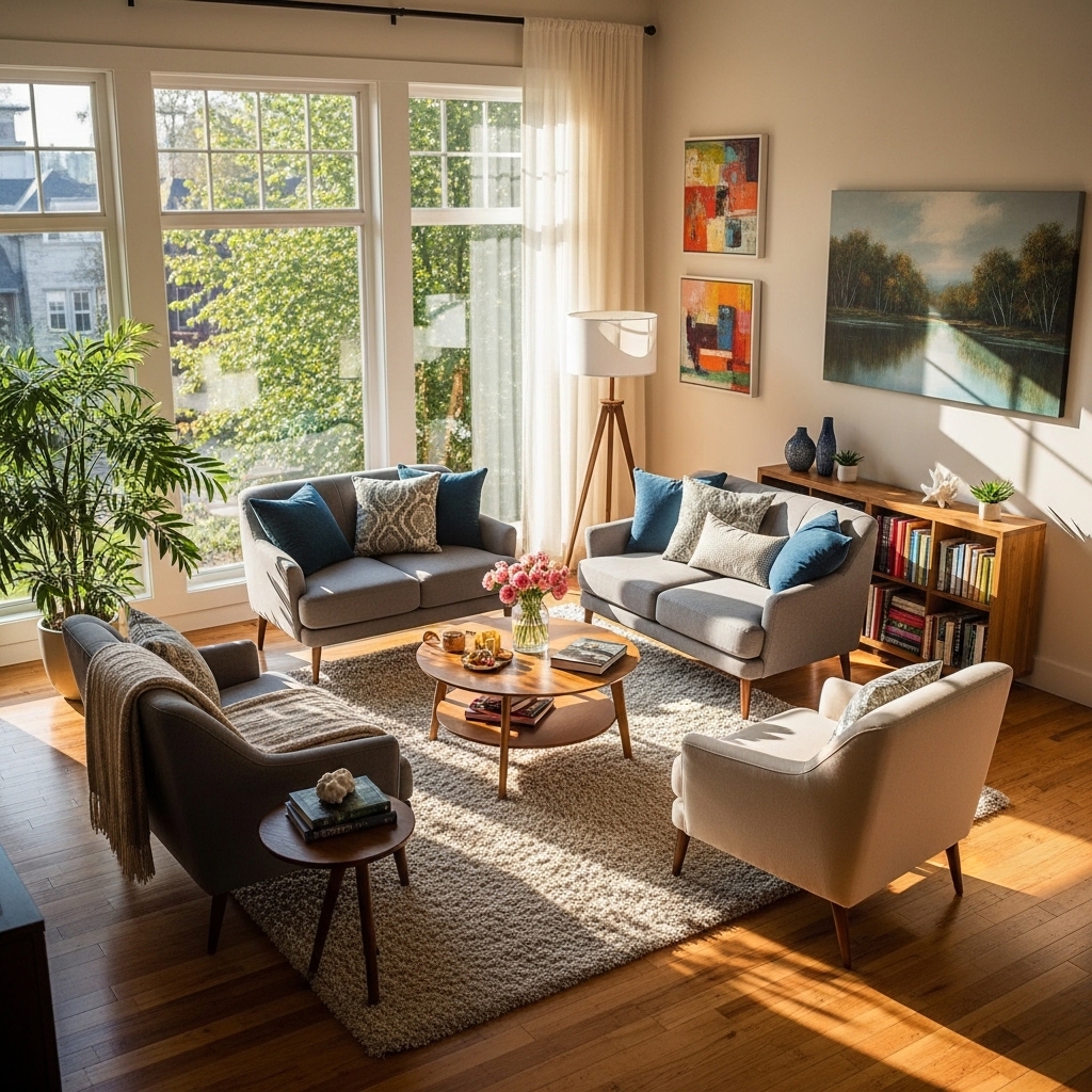 An open concept layout combines the living room with adjacent spaces, such as the dining area or kitchen, creating a more spacious feel. Use furniture like sofas and coffee tables to define the living area without obstructing sightlines. This layout encourages social interaction and allows natural light to flow freely, enhancing the overall ambiance. Incorporate light colors and mirrors to further amplify the sense of space.