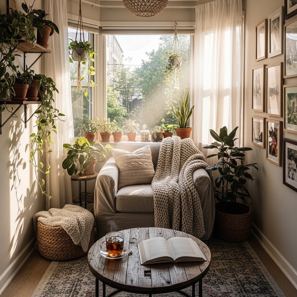 Transform an unused corner into a charming nook by adding built-in seating or a small bench with cushions. This cozy retreat can become a perfect reading spot or a place to enjoy a cup of coffee. By utilizing vertical space with shelves or wall art, you create an inviting atmosphere while maximizing every inch of your small living room.