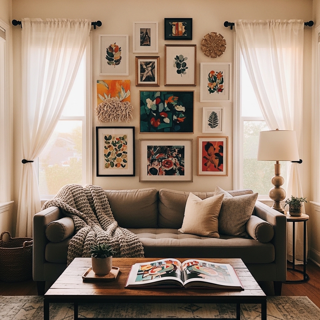 Creating a gallery wall can draw the eye upward, making the room feel larger. Use a mix of framed art, photographs, and mirrors to showcase your personality and style. Position a comfortable sofa opposite the gallery wall for a focal point that encourages conversation and admiration. This layout not only saves space but also adds character to your living area.